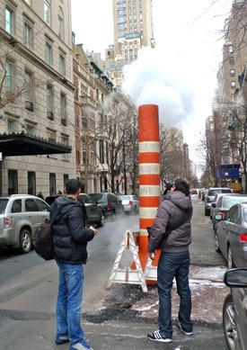 On her way to the theater, she decided it would be fun to photograph the photographers. First, she spotted two men looking at different angles at the steam vent on 74th St. (both were European, just for the record). Then she watched as another European man stood in the middle of the roadway to chronicle the onslaught of horse driven carriages that make their way into Central Park.