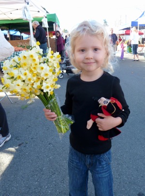 The Dawn Jogger has had company this weekend. Grace came for an overnight yesterday. They dined al fresco (it’s in the 70s!) and went to a show put on by the M-A dance team. (Bring on the funk, bring on the noise.) One thing they do each time Grace spends the night is go to the Menlo Park farmers market on Sunday morning, which had lots of attractions for a three-year-old today. Grace loves flowers and picking out three sweet smelling bouquets was almost as good as getting a balloon lady bug from Daffy Dan. Such a good and sunny companion. Her parents are arriving for the Super Bowl…