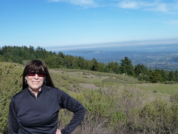 There were many goodies at dinner last night, so even before they went to bed the Dawn Jogger and weekend guest Christine were resolved to do a good hike today. The closest and obvious choice is the Windy Hill loop that goes up the sunny spine and looks back down Hamm’s Gulch, a route of between 6 and 7 miles. The key is the steep climb up, a great workout. The pleasure is the route down, through beautiful Redwood forests and oak trees covered with moss. The surprise was that foggy as it was in Menlo this morning – dense and drippy – it was sunny and clear out in Portola Valley. Great to have fit friends along on the journey…