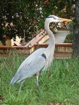 The male Dawn Jogger coined the term “poser” for the many Great Blue Herons and snowy egrets that DJs would see on their morning runs and weekend hikes. These birds appear to stake territory so you often see them in the same area over a period of weeks (like the egret now hanging around Big Dish land). And they do tend to warily “pose,” as long as you don’t get to close. This morning there was a Great Blue Heron hunting for its breakfast on the banks of Lake Lagunita that held its ground, allowing the DJ to get within five feet. Must have not wanted to get too far away from some tasting morsel it had its eye on…