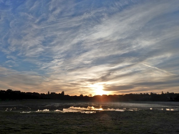 The Dawn Jogger was treated to the changing textures of the sunrise this morning. The sky was still pink when she jogged across the second fairway. By the time she was all around Lake Lagunita, the sun was fully up and the clouds streaks of white. And yes, it was in the chilly high 30s…