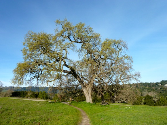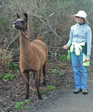 The Dawn Jogger took the weatherman’s warning to pursue outdoor activities today, not tomorrow when rain is expected to return. She hadn’t been out to Arastradero for awhile – previous rains would have made many the trails really muddy. But after a week long dry period, she figured it was a good morning to see that open space at its glorious green best. As she made her way up the hill, she noticed that her favorite oak was starting to bud. But the favorite sighting of the day was the llama getting his usual Saturday AM outing. Doesn’t everyone see llamas while jogging?…