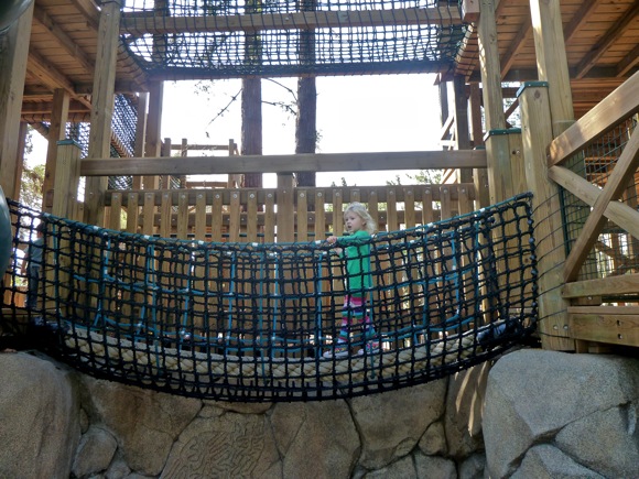 It was awake a dawn if not jogging at dawn today. Grace appeared unexpectedly in the Dawn Jogger’s bedroom at 6:30 am this morning, much earlier than she usually rises. She was coaxed into hopping in for another hour but then it was “let’s get going.” The day’s activity was a trip to Happy Hollow Farm and Zoo in San Jose, a first visit for both. The popular family park completed a renovation a year ago and has a mix animals to look at, animals to touch, puppet theater, kiddie rides and various climbing structures – one that extends upward amidst redwood trees.