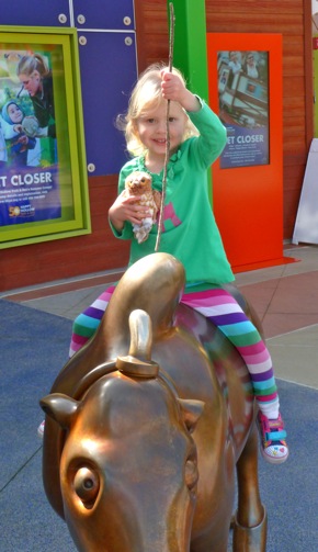 Grace was most excited by the roller coaster – she clapped in glee as it started up its short climb – but she spent the most time on the big climbing structure, learning how to navigate across roped bridges and sliding down big slides. As they were leaving she posed with her loot – a stuffed owl and a stick. Her attraction to stick mimics that of a typical boy…