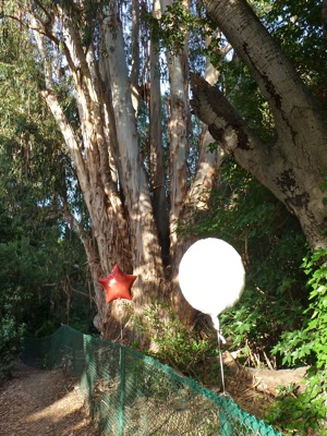 The Dawn Jogger is glad someone has something to celebrate. She noticed the balloons lining a stretch of fence along San Francisquito Creek during her dawn outing this morning. But celebrating she is not, given the news that Buster Posey is out for the season. There’s been a lot of chatter in the press about how dangerous playing catcher is and that the Giants management should move their valuable future face of the franchise to another position. That will now only increase post last night’s collision. In an irony of sorts, she’s headed up the Yard today for a day game..
