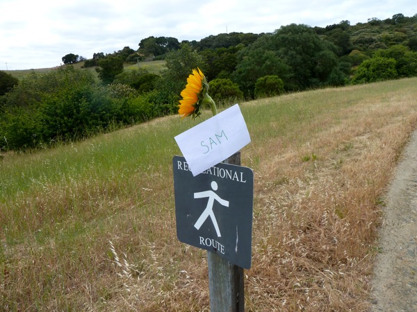 The Dawn Jogger was not out anywhere near dawn this morning, choosing to sleep in on the Memorial Day holiday. So by the time she got out to Big Dish for a loop walk, there were lots of others pounding the pavement, particularly families. As she made her way down the northernmost trail she came upon a sunflower affixed to a post with a note attached. She took a peek at what was written. Sam was congratulated for making it this far and told to now put on the blindfold. What happened next she’ll never know…