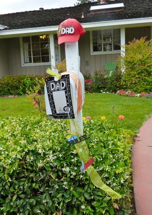The Dawn Jogger feels it’s impossible to follow up her post of June 2. That’s made more difficult by the fact that she’s just been walking various loop neighborhood routes and there’s not a lot new and different to see. That changed a little bit today when she slightly altered her route and came across a front yard pole that had been dedicated to Dad. As it’s not Father’s Day, she’s guessing maybe it’s Dad’s birthday. Or there is just a houseful of grateful children…