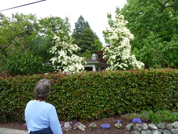 When the Dawn Jogger moved into her Menlo Park neighborhood 21 years ago, she wasn’t working at the time and went walking at least once a week with her across-the-street neighbor Kay and Kay’s wonderful dog Milo. They resurrected that tradition today. Along the way the paused to look at two trees that are so totally in bloom that you can hardly see the leaves. For the moment, they remain mystery trees…