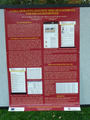 Even though it was well before most people’s breakfast or even wake up time, tables and chairs had been set out near Frost Amphitheater. The topic to be discussed – the 1641 Depositions (top of mind for the DJ, to be sure!). Just in case others are as equally uninformed: “The 1941 Depositions, held in the Library of Trinity College Dublin, are a collection of documents comprising some 8000 personal statements collected from (mainly Protestant) witnesses documenting their experiences of the Irish uprising that began in October 1641. Collected by government-appointed commissioners, the witness testimony runs to approximately 20,000 pages, and constitutes the chief evidence for the sharply contested allegation that the rebellion began with a general massacre of Protestant settlers. The 1641 Depositions are therefore a significant, yet controversial source of informationfor the causes and events surrounding the 1641 Rebellion and a unique account of the social, economic, cultural, religious, political and linguistic history of 17th century Ireland, England and Scotland.” OK, so now you know…