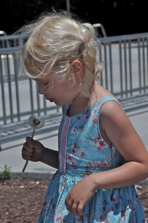 After her preschool recital on Friday night, Grace came home for an overnight with the Dawn Jogger. That made it easy for the two of them to get up on Saturday morning and go berry picking at Webb Ranch. The target this was blackberries and Grace quickly picked two baskets full. The bigger highlight was spotting a baby cottontail rabbit, so much cuter than the the desert hares that are commoner in these parts. (Alas, the cottontails are often discarded Easter pets.) But once again showing how small things delight a 3 1/2 year old, Grace spotted a dandelion on the way home from playing in the kindergarten yard at the nearby school. And she now just what to do with it – blow…