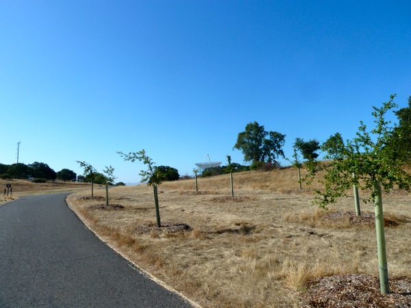 For the first time in months, the Dawn Jogger has run every day this week. No walk breaks. No cranky knee pain. So she thought it time for a further test by jogging the Dish. On the way up she spotted a new forest of planted oaks, providing a good geometric foreground to the Dish itself. Being cautious, she walked rather than jogged the steeper down hill parts, which is what she thinks aggravates the knee. So far, so good…