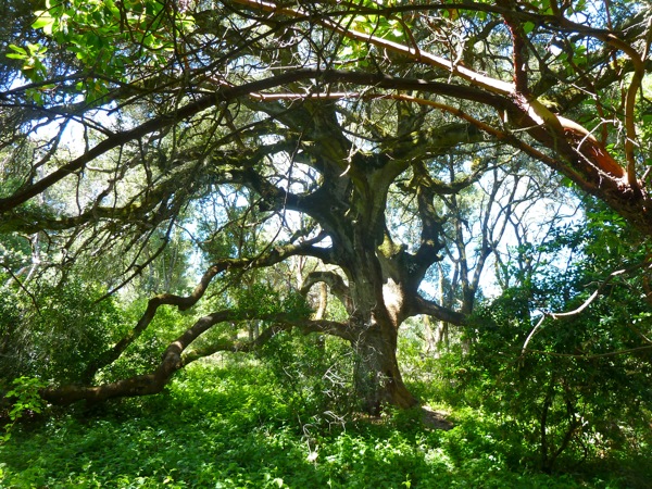 When the DJs and Cassie wanted a short but good workout hike, they’d head out to Portola Valley and the trails maintained by that town. About half allow dogs, so they’d stick to those on their outings. Late this morning the female DJ did a slightly different loop, incorporating some of the “no dog trails.” Like yesterday, the coastal fog kept the morning great for walking, although it matters less as the PV trails have lots of shade. Like she’s seen elsewhere, there was still a lot of greenery due to the June rains. As she headed back down hill after the good climb up, she spotted a particularly artistic oak. Like many things, it was prettier in person…