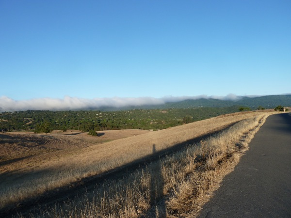 The weather forecasters predicted cooler than average temps early in the week due to the heavy fog bank on the coast. In was much in evidence on the western hills. As for the photo, she liked the various “speed lines” and the texture. And the gold against the blue…