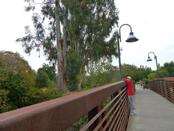 The Dawn Jogger hasn’t much thought about the San Mateo bike bridge over San Francisquito Creek being a large structure. But it sure looked that way this morning when friend Gail tried to look over the top to the water below about halfway through the neighborhood loop walk. Yes, it’s July 21 and there’s still water in the Creek. Must be due to the June rains…