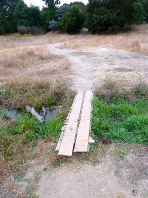Usually by this time of year, there’s not a drop of water anywhere near Lake Lagunita. But the June rains have left a a few large puddles near the dry lake bed. During the rainy months a stream of water pours into the Lake, which, in the past, has necessitated some tricky puddle jumping. Earlier this year, a bridge of sorts was placed across the widest part of the trough of water. And now some enterprising soul has added extra lumber to make sure it holds up during the next rainy season. The fact that it still comes in handy in August is what’s surprising…
