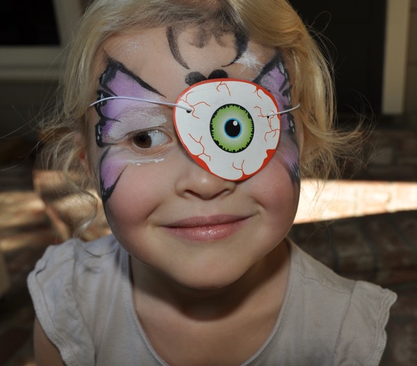 The Dawn Jogger did a swift neighborhood circuit quite early this Saturday morning, all the better to be at Grace’s house before noon. The plan was to attend the St. Raymond Pumpkin Festival and then spend the night. The local festival is perfect for the younger set, lots of easy to “win” games and other activities spread across the school’s field. Grace got her face painted in a butterfly motif. But the real fun was putting on the scary eyeball she won…