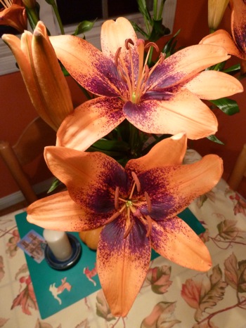 For the past two mornings the Dawn Jogger has been walking all over Menlo Park and taking photos of the wonderful trees displaying their bright oranges and reds of the fall season. But what caught her attention most was the lilies she purchased at Sunday’s farmers market sitting on her kitchen dining table. All the Scott photos taken at the same table after he and the male DJ walked made her smile…