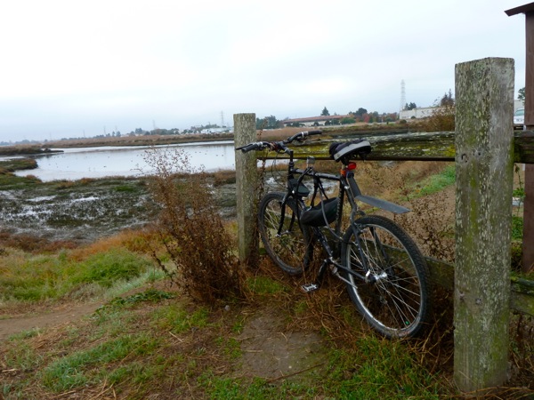 The pea soup fog that blanketed the Peninsula the last two mornings gave way to high overcast today. But that was enough to put a damper on the spectacular sunrises the Dawn Jogger is used to seeing on her Wednesday Bedwell Bayfront Wednesday outings. So she returned to a favorite subject, photographed over the years, a bicycle…